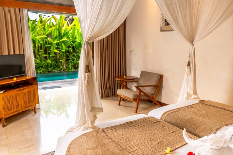 The Two Bedroom Pool Villa offers one spacious unit with private terraces overlooking lush gardens and a private infinity pool. It features a wooden sun deck, dining pavilion with kitchenette, and beautiful tropical surroundings. Inside, the villa showcases wood finishing, marble flooring, and high-quality king-size beds with mosquito nets. Amenities include a sofa bed, 32” LED TV, DVD player, and soft, elegant cotton linen. The bathroom offers a terrazzo open bathtub, natural stone shower, and luxury amenities. The villa, named "Wana Lembi," honors the ancestors of Purana’s owner as a gesture of gratitude.