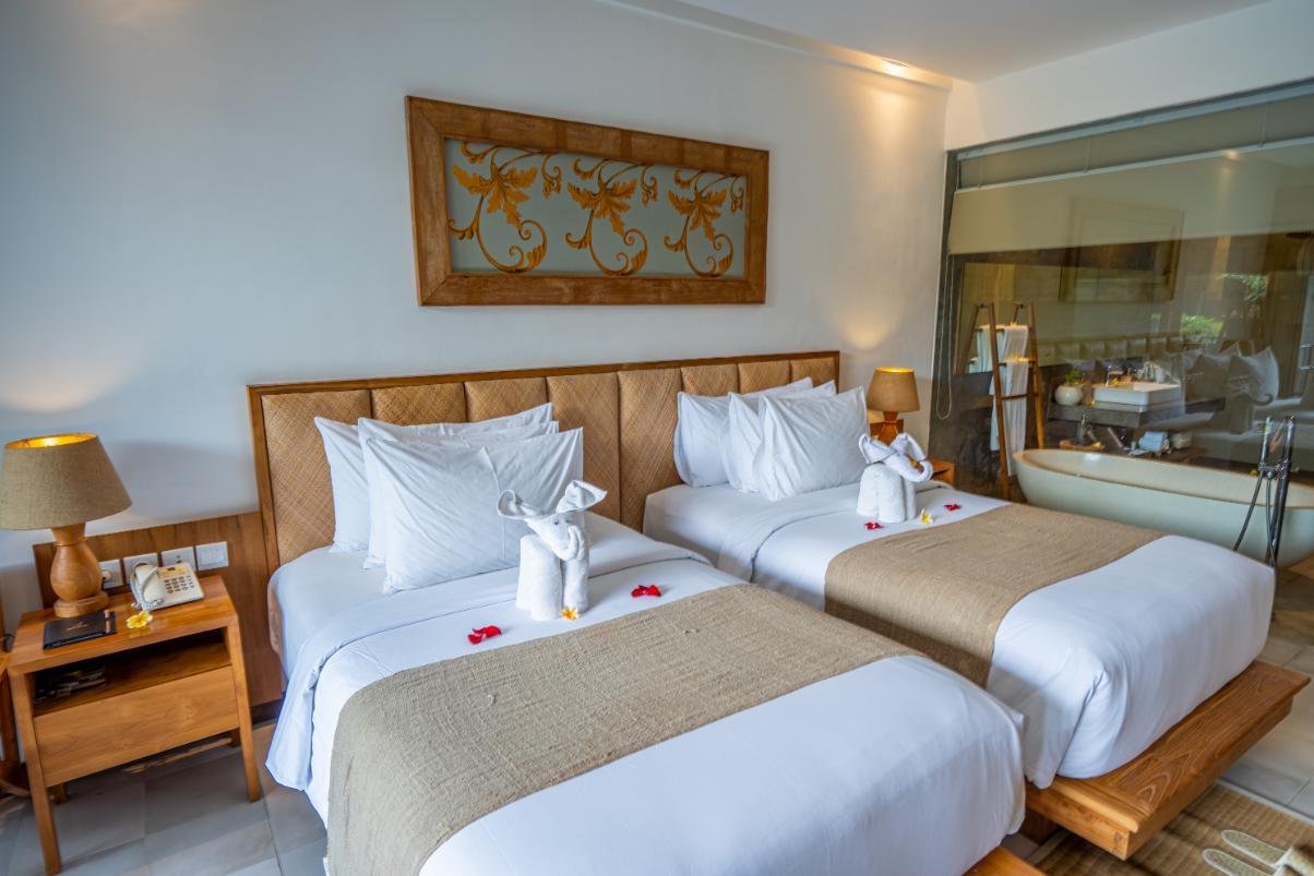 The Two Bedroom Pool Villa offers one spacious unit with private terraces overlooking lush gardens and a private infinity pool. It features a wooden sun deck, dining pavilion with kitchenette, and beautiful tropical surroundings. Inside, the villa showcases wood finishing, marble flooring, and high-quality king-size beds with mosquito nets. Amenities include a sofa bed, 32” LED TV, DVD player, and soft, elegant cotton linen. The bathroom offers a terrazzo open bathtub, natural stone shower, and luxury amenities. The villa, named "Wana Lembi," honors the ancestors of Purana’s owner as a gesture of gratitude.